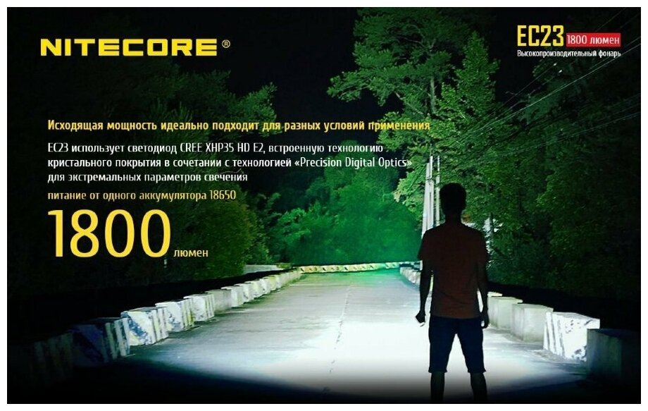 Лучшие цены. NITECORE EC23 - это новейший высокопроизводительный, ультрамощный повседневный EDC-фонарь компактного размера в цельнолитом корпусе. Он считается одним из самых ярких представителей в серии "E", созданной специально для спортсменов и туристов. EC23 оснащён светодиодом CREE XHP35 HD E2 с ресурсом 50000 часов, чтобы обеспечить полноценную ослепительную мощность целых 1800 люмен. Магазины в вашем городе.