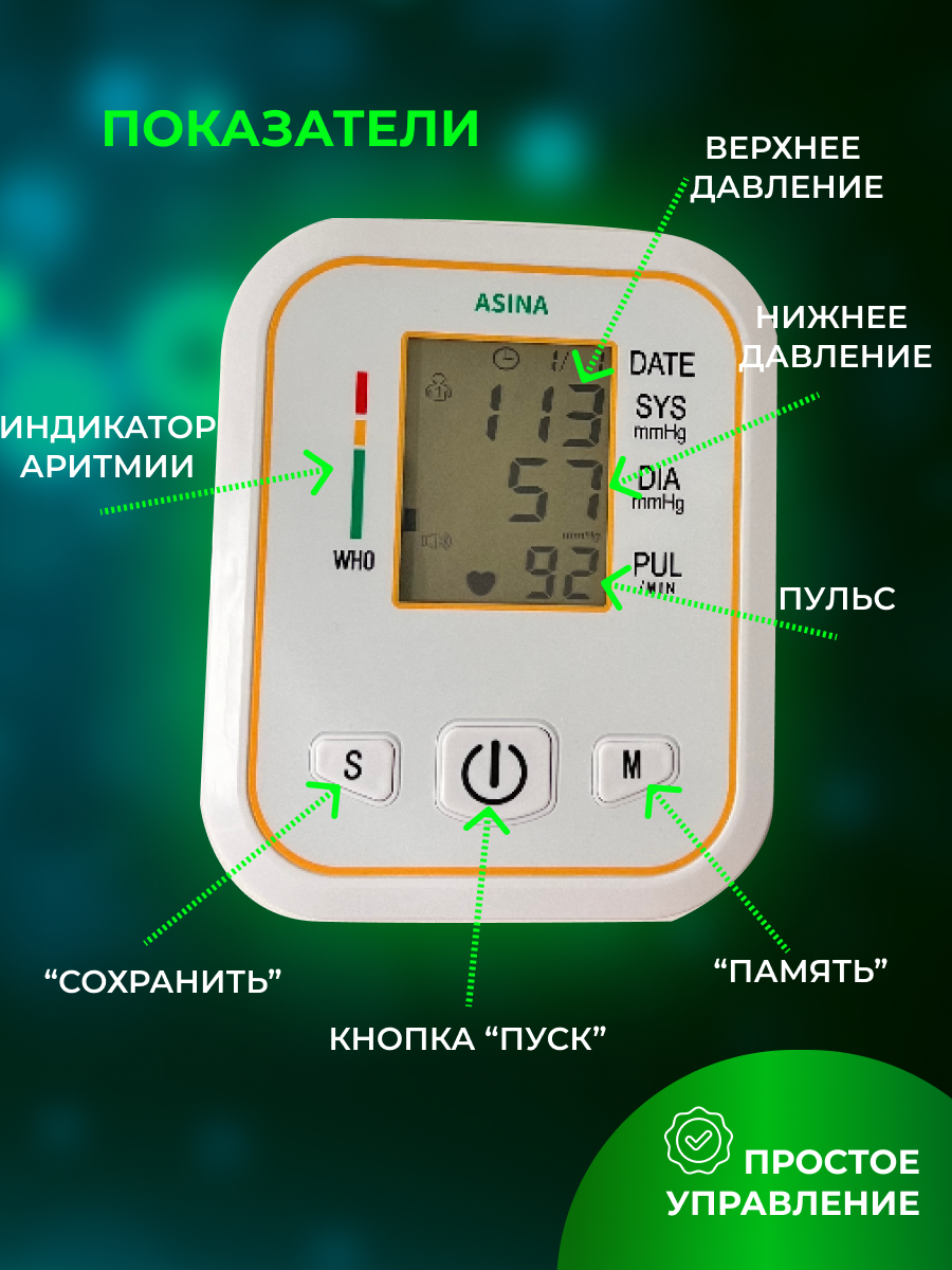 | Функции | измерение пульса / определение аритмии / расчет среднего давления / индикация даты и времени / цветная шкала ВОЗ |