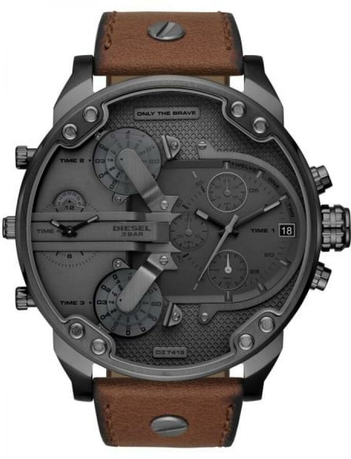 Лучшие цены. Diesel Mr. Daddy 2.0. Кварцевый хронограф. 4 механизма. 4 часовых пояса. Секундомер на основном циферблате. Окошко даты. Корпус из нержавеющей стали с IP покрытием серого металлического цвета. Размеры корпуса 57х67 см. Магазины в вашем городе.