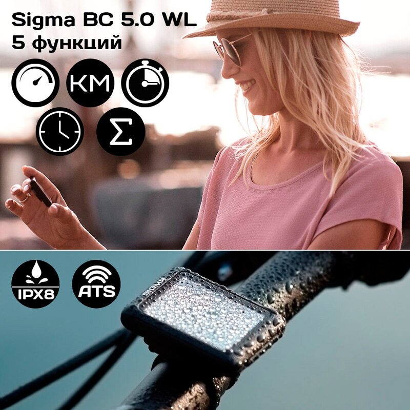 Лучшие цены. Велокомпьютер Sigma BC 5.0 WL ATS работает по беспроводной технологии ATS и не требует фиксации никаких дополнительных проводов, идущих от руля до колеса. У него четкий и легко читаемый дисплей. Несмотря на небольшие размеры на экране умещаются три строки с цифровыми и символьными значениями. На всем протяжении пути отображается текущая скорость и одна из четырех оставшихся функций: время в пути, километраж поездки, суммарное расстояние или часы. Магазины в вашем городе.