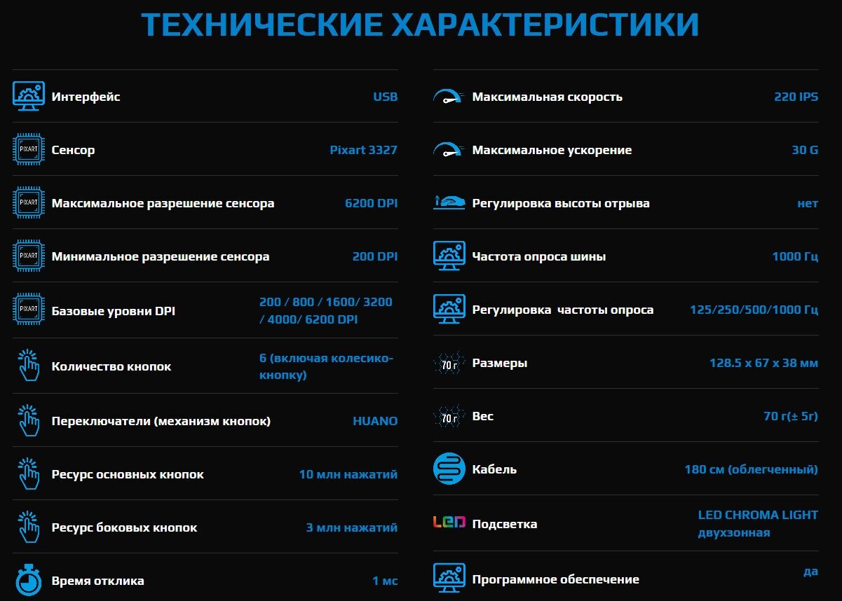 Лучшие цены. PIXART 3327 с микроконтроллером. Высококачественный игровой сенсор от компании PIXART обеспечивает высокую точность позиционирования курсора, а также мгновенную реакцию на движение руки пользователя.От 200 DPI до 6 400 DPI – разрешение сенсора. Предустановленные уровни – 200/ 800/ 1600 / 3200/ 4000/ 6200 DPI. При использовании фирменного программного обеспечения всегда можно произвести тонкую настройку уровней разрешения сенсора от 200 DPI до 12000 DPI с шагом в 100 DPI.220 IPS / 30 G. Магазины в вашем городе.