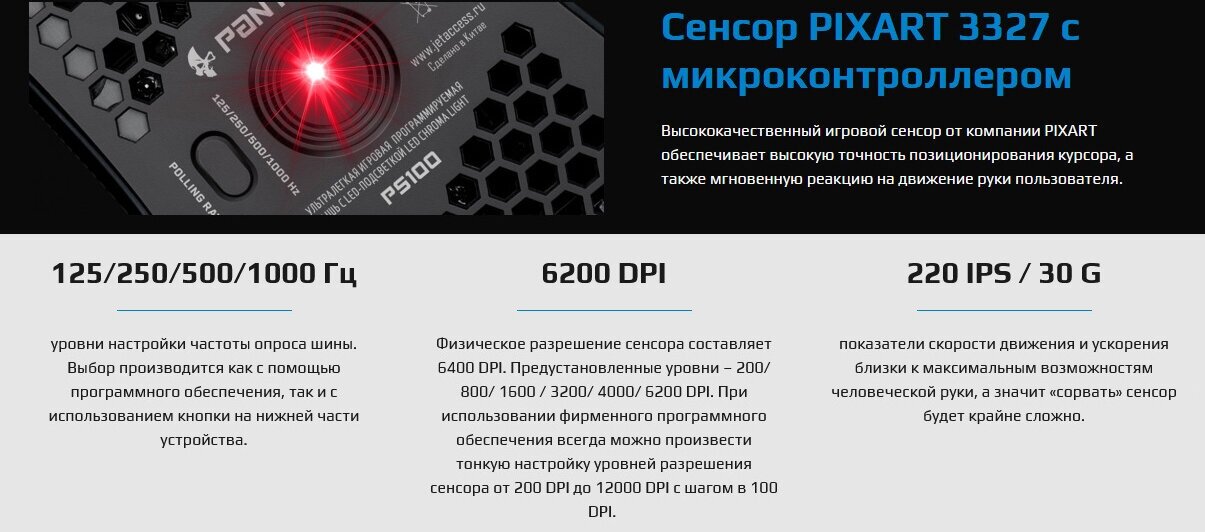 Игровая мышь USB Jet.A Panteon PS100 6200dpi, 6 кнопок, LED, 70 г, кабель 1.8м, USB,Ультралегкая