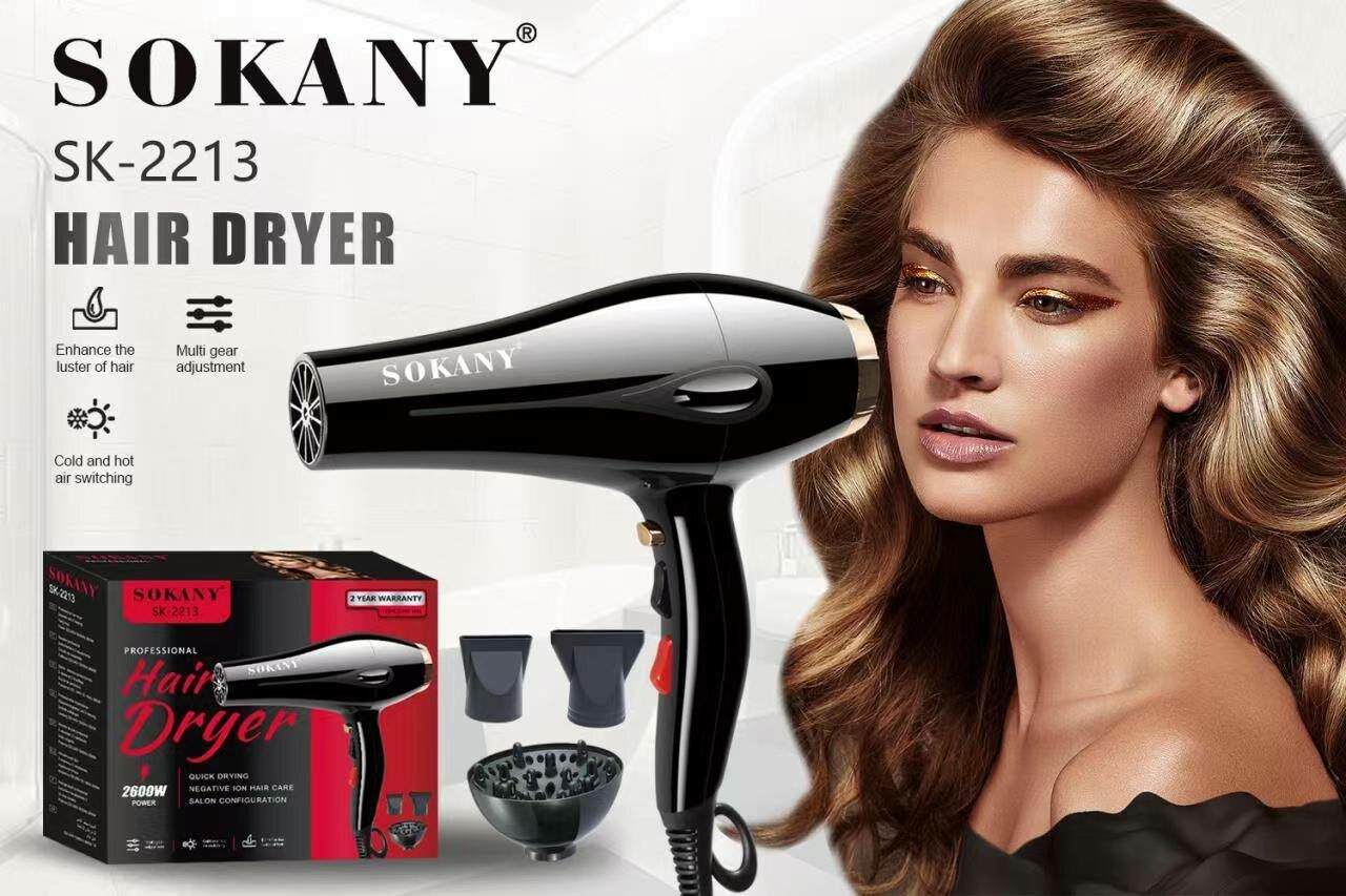 Лучшие цены. Профессиональный фен для волос Sokany SK-2213 - это незаменимый помощник для каждой женщины. С его помощью можно быстро и без повреждений высушить и уложить волосы, а также создать красивую и пышную прическу. Мощность 2600 Вт обеспечивает быстрый результат, а две скорости воздушного потока гарантируют надежную фиксацию и быструю сушку. Фен оснащен функцией ионизации, которая предотвращает пересушивание волос даже при сушке горячим воздухом. Магазины в вашем городе.