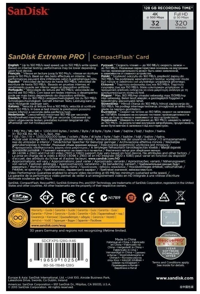 Лучшие цены. Соответствие стандарту VPG-65 для съемки видео кинематографического качества SanDisk Extreme PRO CompactFlash — первая в мире карта высокой емкости, поддерживающая спецификацию VPG-65 (Video Performance Guarantee), которая гарантирует беспрепятственную съемку видео в форматах 4K и Full HD. Эта карта памяти создана для специалистов, заинтересованных в максимальной надежности высококачественной видеосъемки. Магазины в вашем городе.