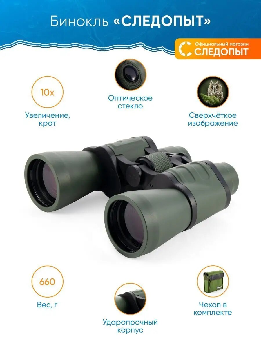 Бинокль туристический 10x50 "следопыт", зеленый-защитный, 180*85*180 мм, 660 гр., в чехле / Бинокль охотничий / Бинокль мощный / Бинокль профессиональный
