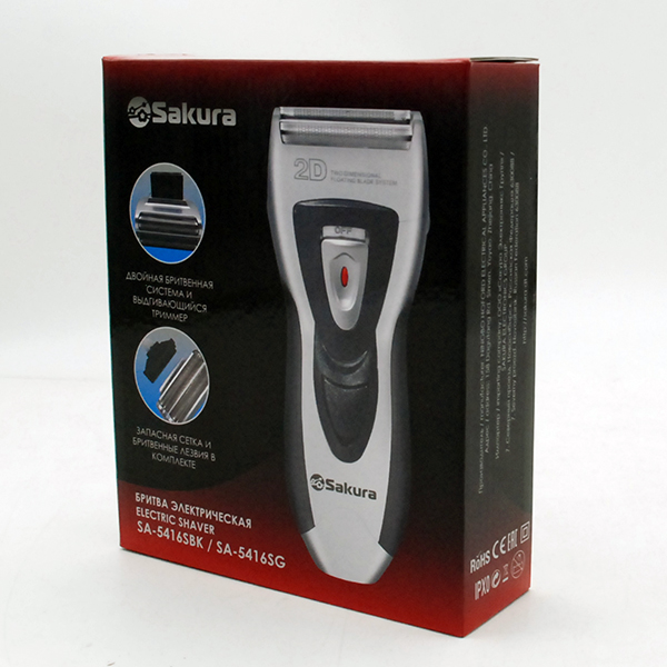 Электробритва аккумуляторная, Sakura, SA-5416SBK, сеточная, сухая, 2 сетки, серебряно-черная