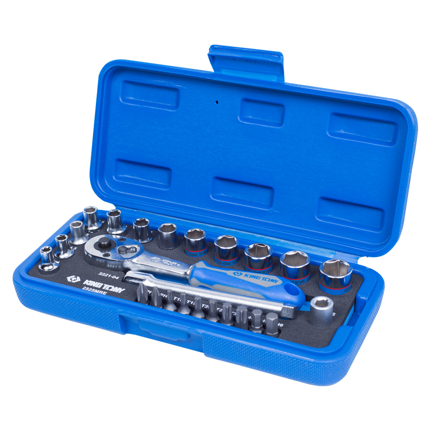 Набор торцевых головок с принадлежностями 1/4", шестигранные, 4-13 мм, 25 предметов KING TONY 2525MRE