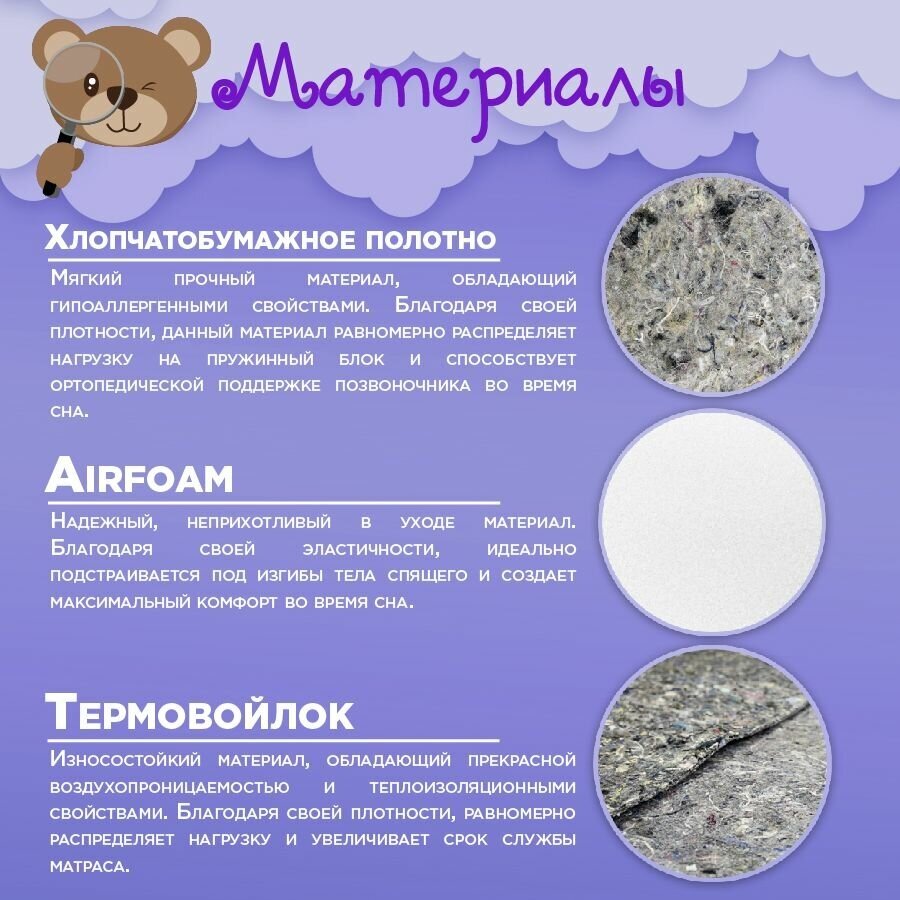 Лучшие цены. Детский матрас BeautySon Baby Elite BS 60x120 – матрас с зависимым пружинным блоком Bonnel (Боннель), обладающий анатомическими свойствами. Жесткость сторон: Полумягкий / Полумягкий В составе матраса используются современные гипоаллергенные материалы – AirFoam и хлопчатобумажное полотно • Бесклеевая технология сборки позволила отказаться от использования поролонового короба и увеличить количество пружин до 50% больше, чем у других производителей. • AirFoam – надежный, неприхотливый в уходе материал. Магазины в вашем городе.