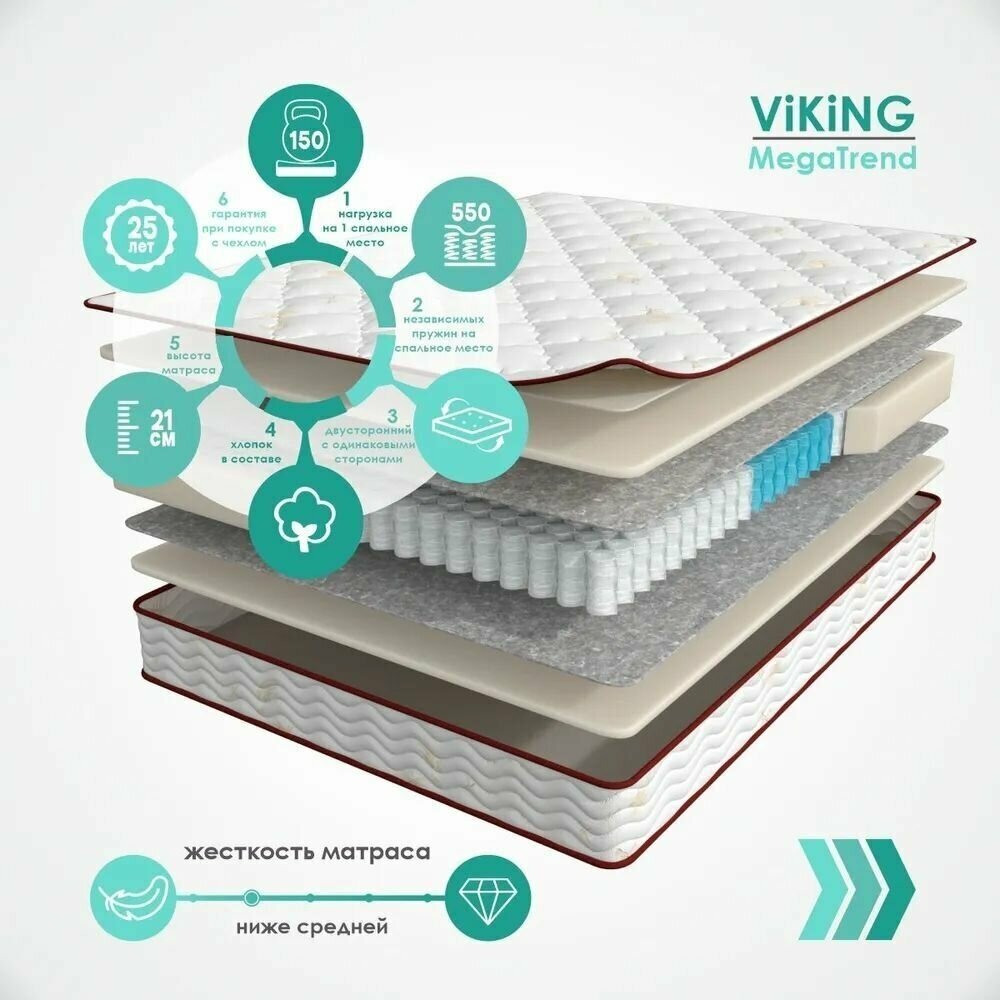 Лучшие цены. Матрас MEGATREND VIKING - ортопедический матрас с жёсткостью ниже средней. Подойдётдля людей с небольшим весом, а так же для людей с разными весовыми категориями. В состав матраса входит высокоэластичная пена и войлок. В нашем магазине Вы можете купить любой размер матраса данной модели на особых условиях: скидки, акции, подарки! Позвоните нам и менеджер подробно расскажет Вам о действующий акциях на данную модель матраса в настоящий момент. Магазины в вашем городе.