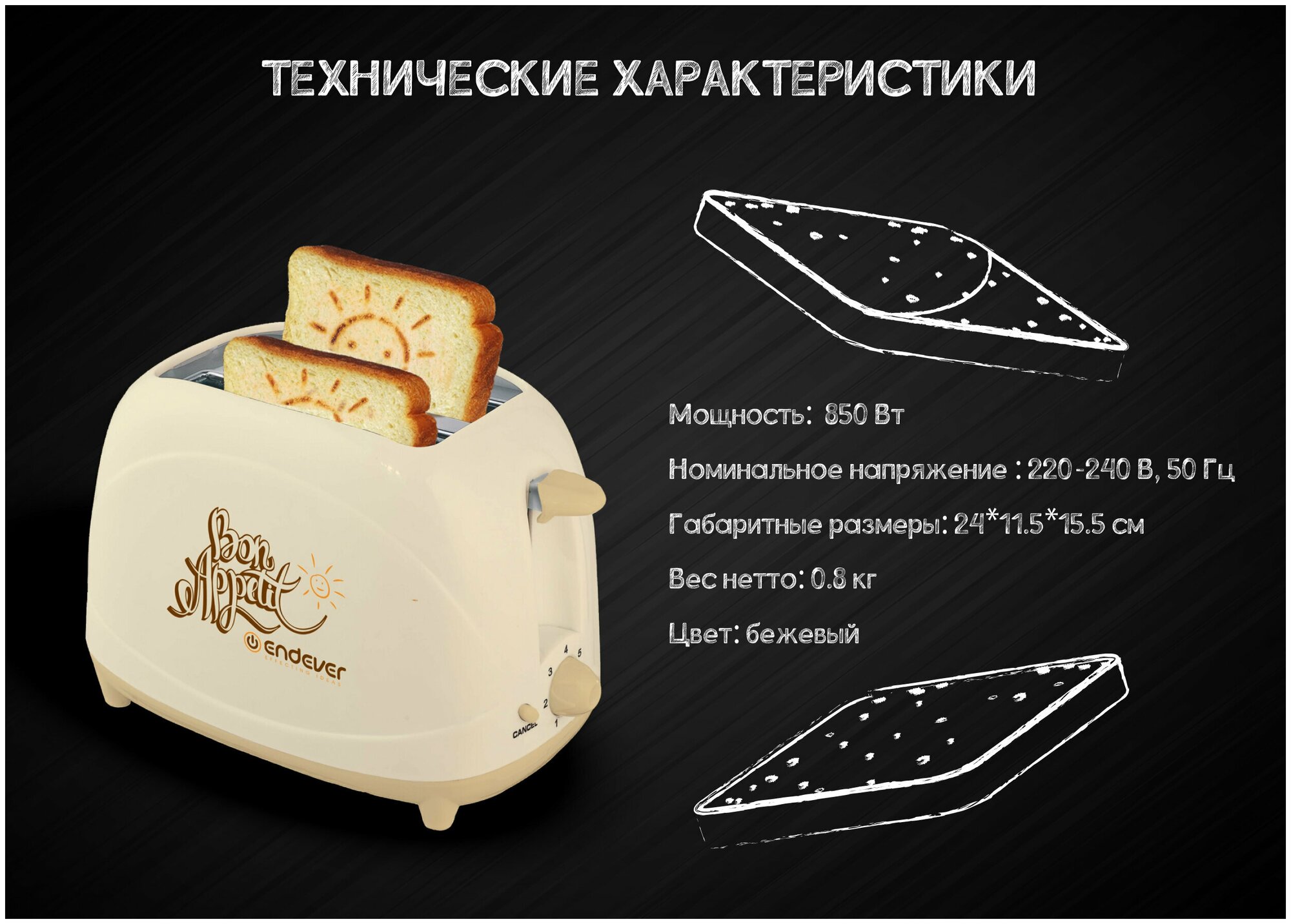 Тостер для хлеба Endever ST-107, съемный трафарет для рисунка на тосте / 7 режимов / функции отмены, центрирования / автоматический выброс тостов