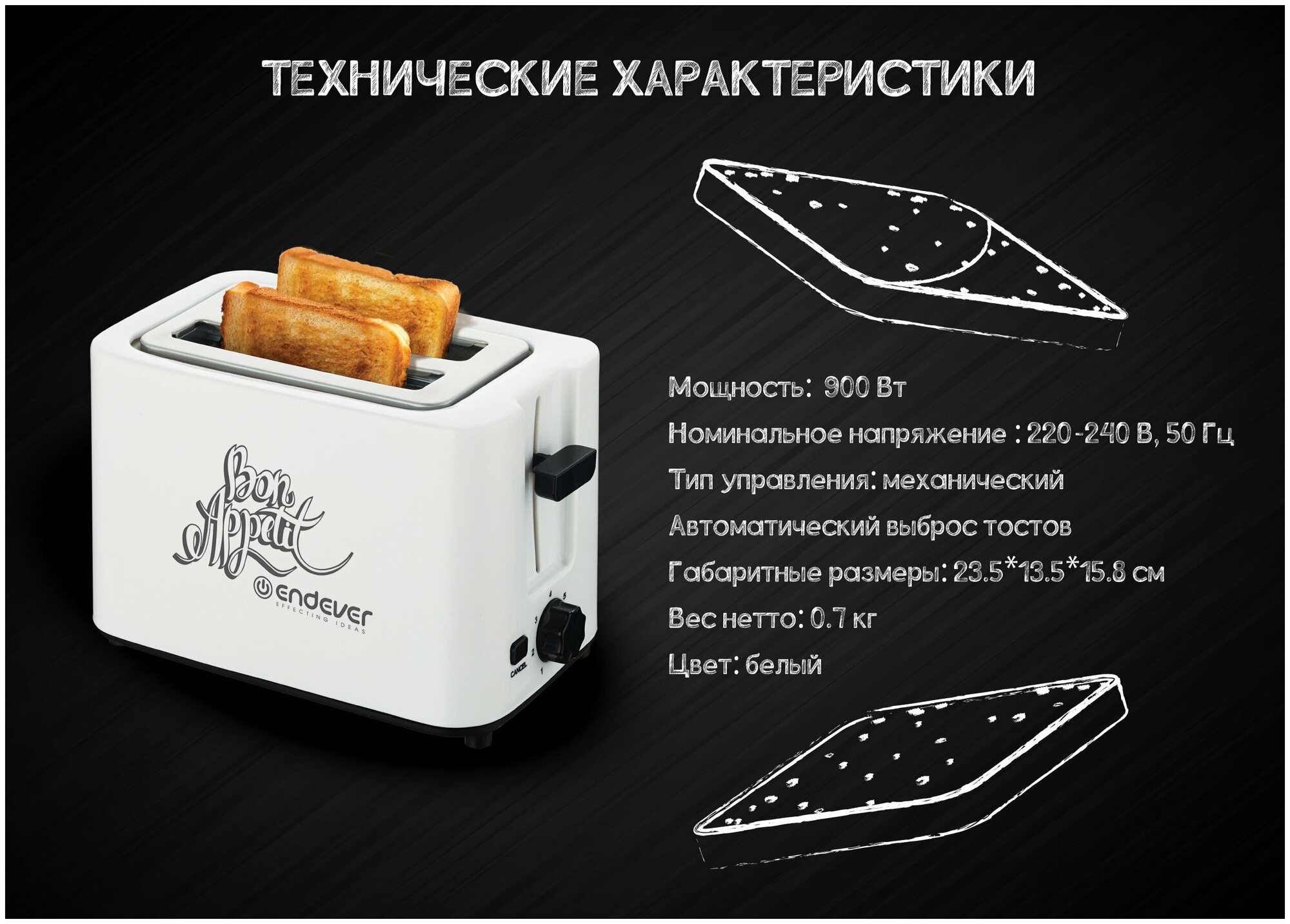 Лучшие цены. Тостер электрический Endever Skyline ST-111, мощность 900 Вт, съемный трафарет для рисунка на тосте! 7 регулировок поджаривания, 2 отсека для загрузки тостов, механическое управление, автоматический выброс тостов, съемный поддон для легкой очистки, отсек для хранения сетевого шнура, термоизолированный корпус, функция отмены процесса, 6 шт./уп. Магазины в вашем городе.