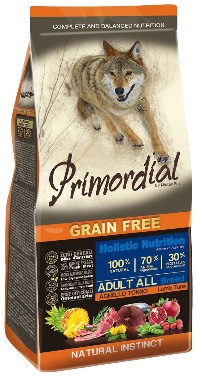PRIMORDIAL ADULT ALL BREED беззерновой для взрослых собак всех пород с тунцом и ягненком (12 кг)