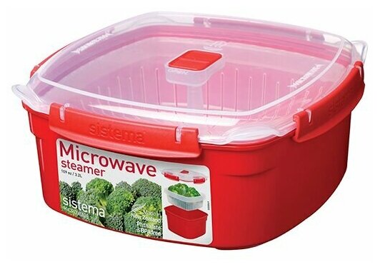 Лучшие цены. Контейнер предназначен для приготовления блюд из овощей, рыбы и птицы. Имеет съёмную паровую корзину, стержень которой не нагревается. Обладает специальной формой с ненагревающимися захватами по углам. Паровыпускное отверстие обеспечивает отсутствие брызг в микроволновой печи. Подходит для использования в холодильнике и морозильной камере. Плотное закрытие обеспечивают фирменные защёлки Sistema. Можно мыть в посудомоечной машине. Не содержит бисфенол А и фталаты. Магазины в вашем городе.
