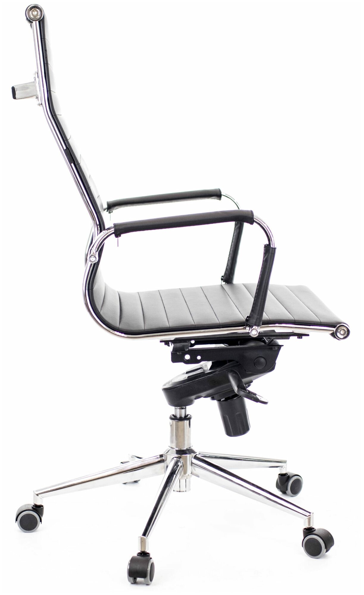 Лучшие цены. Строгое стильное черное кресло с обивкой из экокожи. Отлично подойдет руководителю, кому нужно простое и комфортное рабочее место, а не внешние атрибуты роскоши. Все необходимое и ничего лишнего: регулировка по высоте, механизм качания с фиксированием удобного угла наклона и степени упругости качания, стальная крестовина и ролики, подходящие для паркета. Магазины в вашем городе.