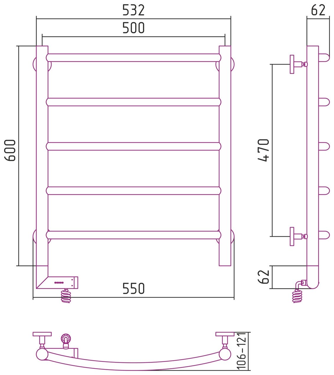 Полотенцесушитель электрический Сунержа Галант 2.0 600х500 с блоком управления слева, 00-5200-6050