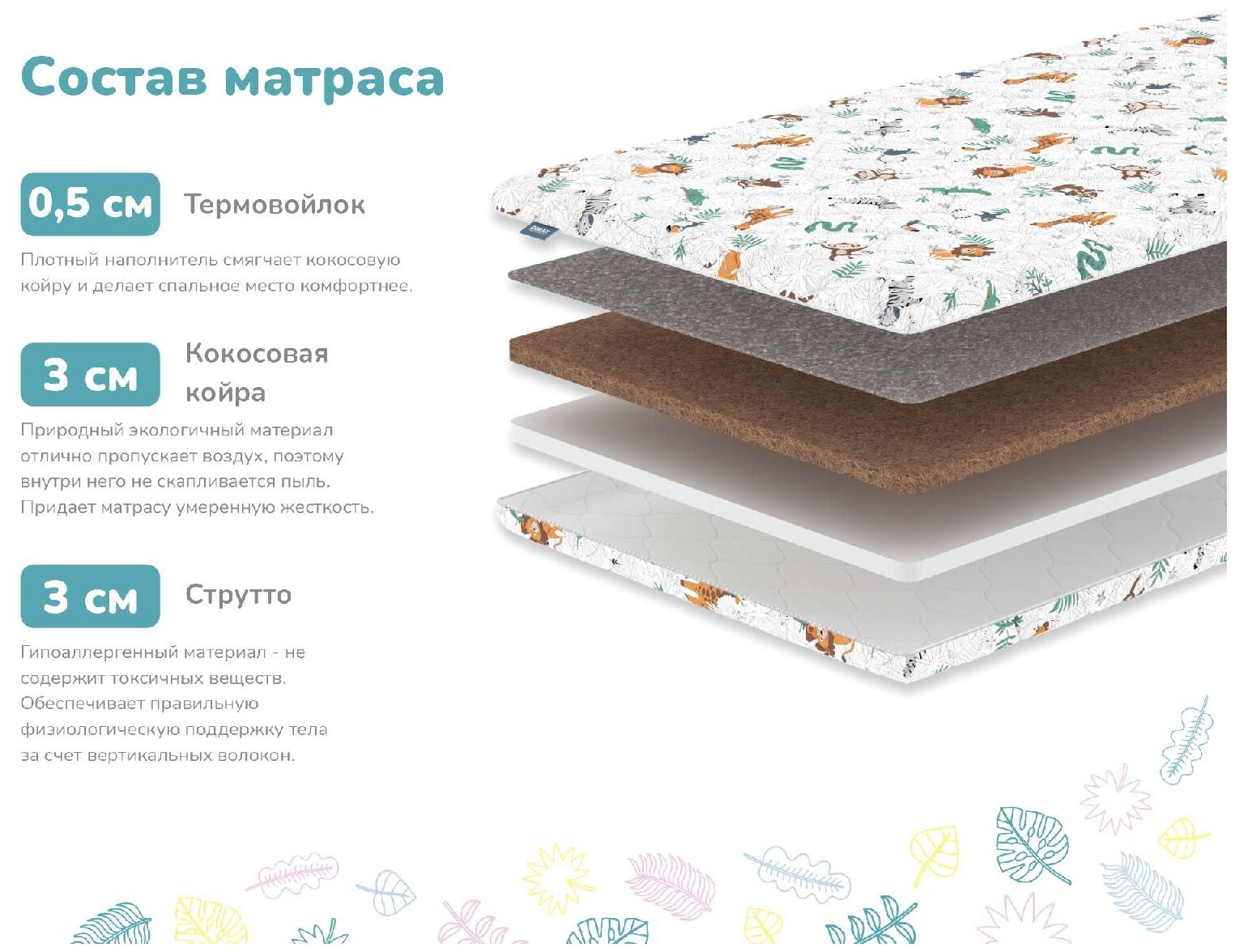 Лучшие цены. Детский матрас Dimax Непоседа станет удачным выбором для тех, кто в силу обстоятельств не готов вкладываться в дорогую покупку, но нацелен на качество и безопасность, приобретая товары для детей. Модель беспружинная, состоит из двух разных наполнителей. Они гармонично сочетают в себе комфорт и жёсткость одновременно. С одной стороны – кокосовая койра (3 см) обеспечивает ортопедическую опору растущему позвоночнику ребёнка, с другой – струттофайбер (3 см) даёт комфортную поддержку всему телу. Магазины в вашем городе.