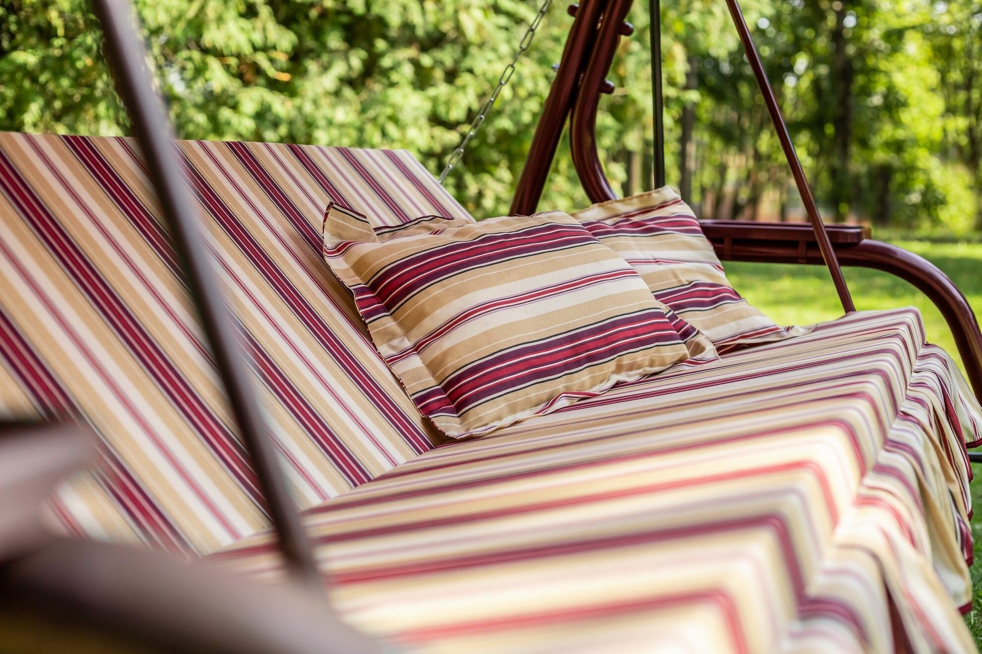Садовая качель Качели садовые 3-х местные Мебельторг Стандарт Nova Каркас бордовый/Бордовый,бежевый рис.полоска
