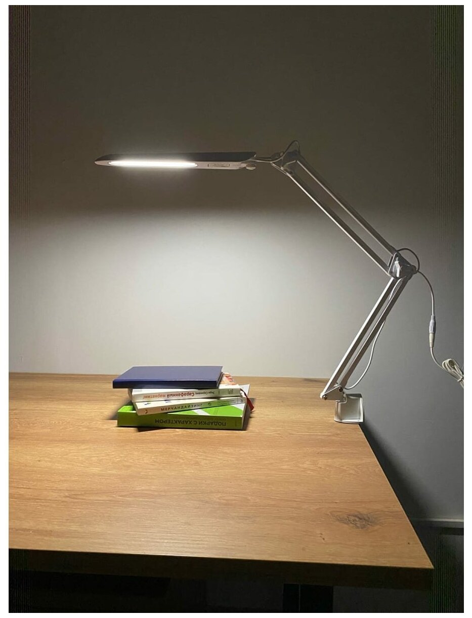 Лучшие цены. Настольный светодиодный светильник на струбцине. Механизм ориентации и удержания плафона в горизонтальном положении при любом изменении угла наклона стойки светильника. 30 000 часов работы без потери яркости свечения. Стойка светильника полностью металлическая. Сенсорный выключатель на плафоне. Диммер. Магазины в вашем городе.