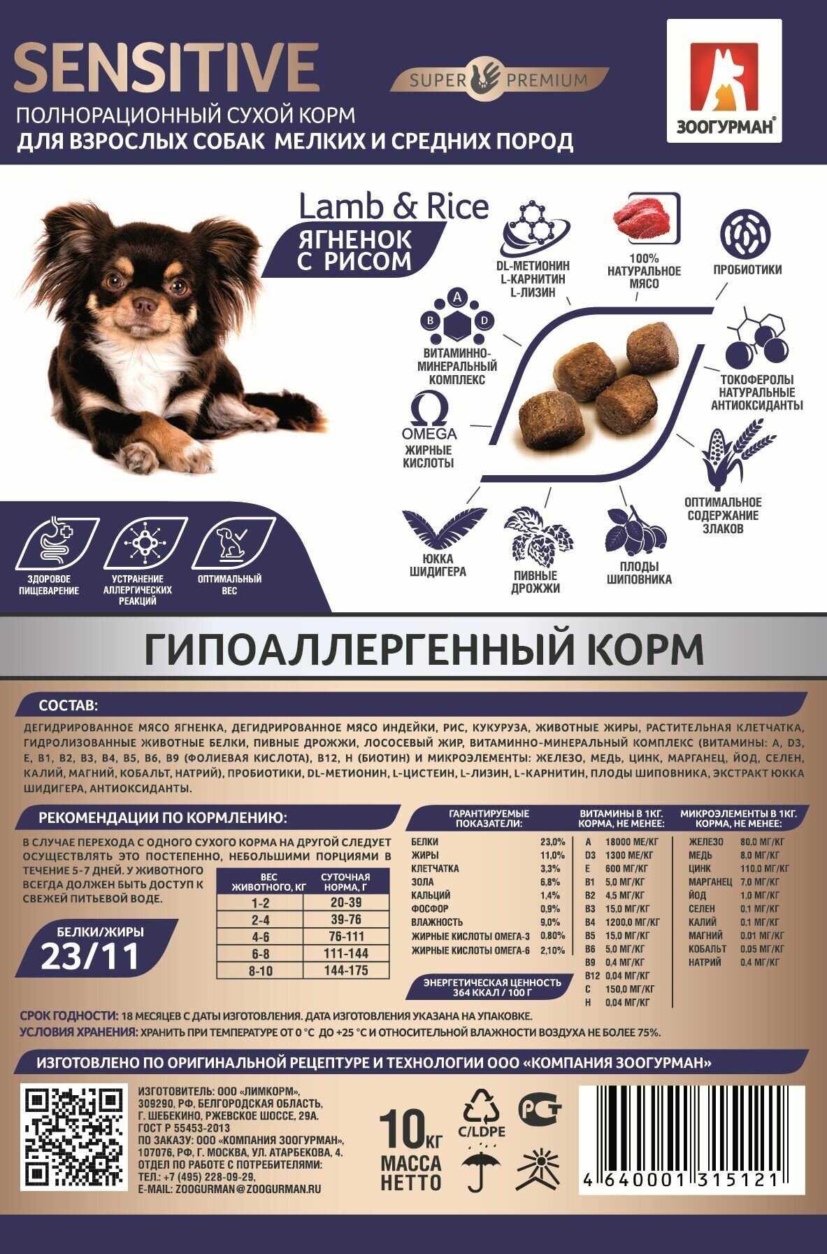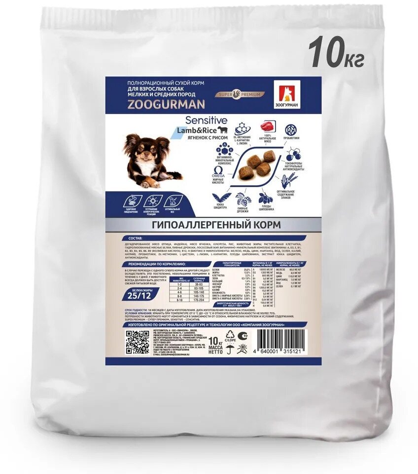 ZOOGURMAN SENSITIVE для взрослых собак маленьких и средних пород при аллергии с ягненком и рисом (10 + 10 кг)