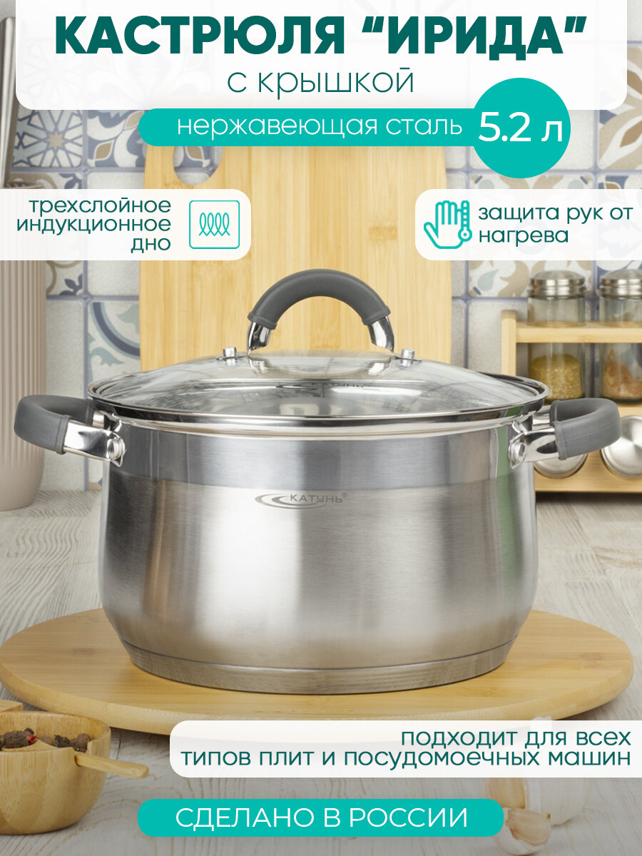Кастрюля нерж, 5.2 л, с крыш, Катунь, Ирида, КТ08-D-22, индукц