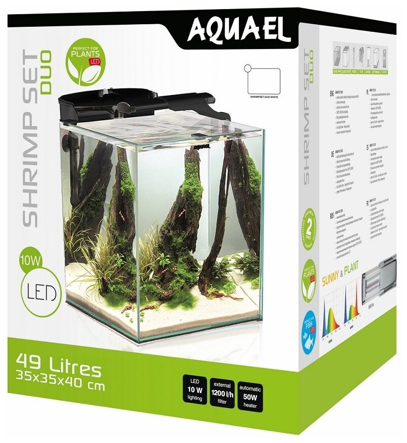 AQUAEL Аквариум Fish&Shrimp Set DUO D&N 2.0/49л белый, 35х35х40см. Комплектация: стеклянная крышка, свет Leddy Slim Duo Sanny/Plant 10Вт, фильтр Versamax 3, нагреватель нерегулируемый FIX 50W, коврик. (Польша)