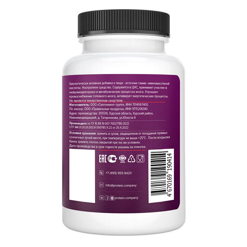 GABA 700 mg / PROTEIN.COMPANY / гамк, гамма-аминомасляная / Капсулы / 30 порций / 90 капсул