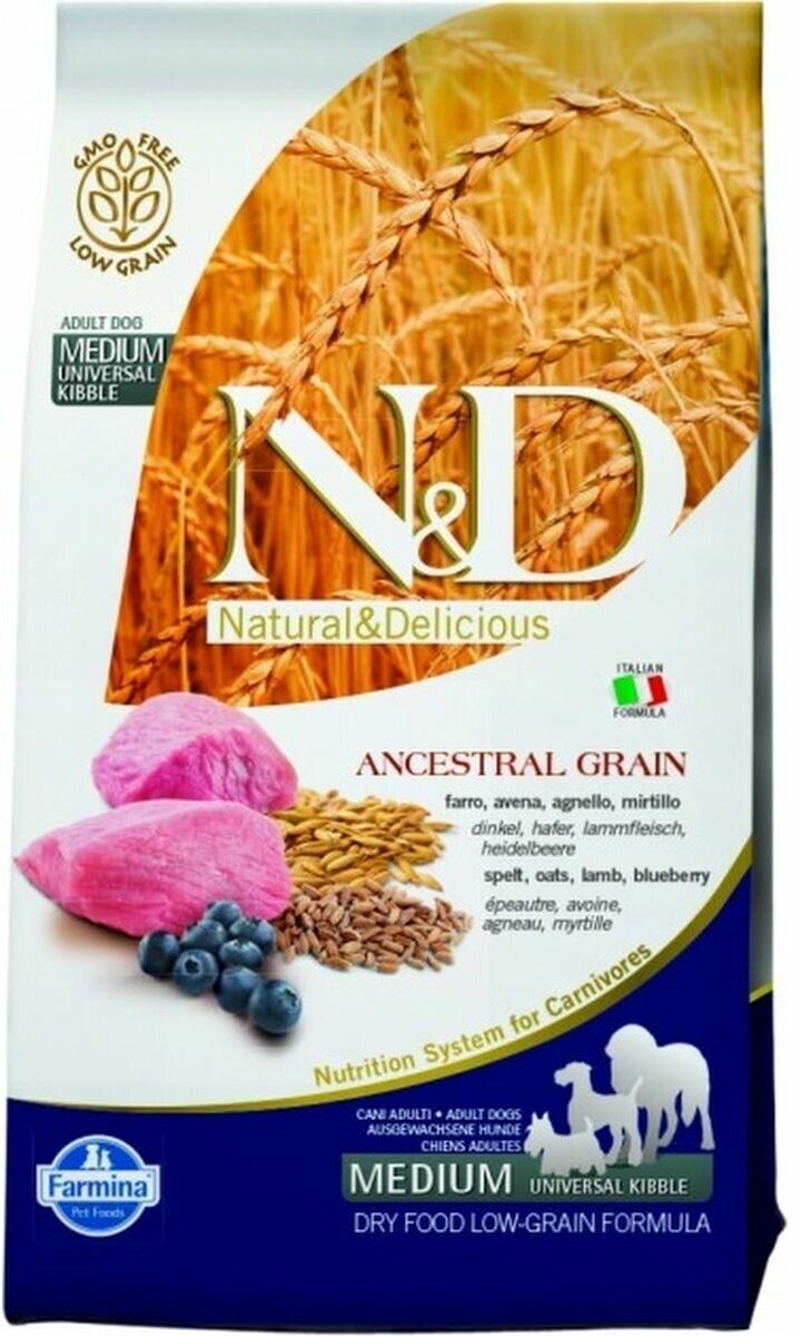 Сухой корм Farmina N&D Ancestral Grain Lamb & Blueberry Adult Medium & Maxi, низкозерновой, для взрослых собак средних и крупных пород, ягненок и черника, 12 кг