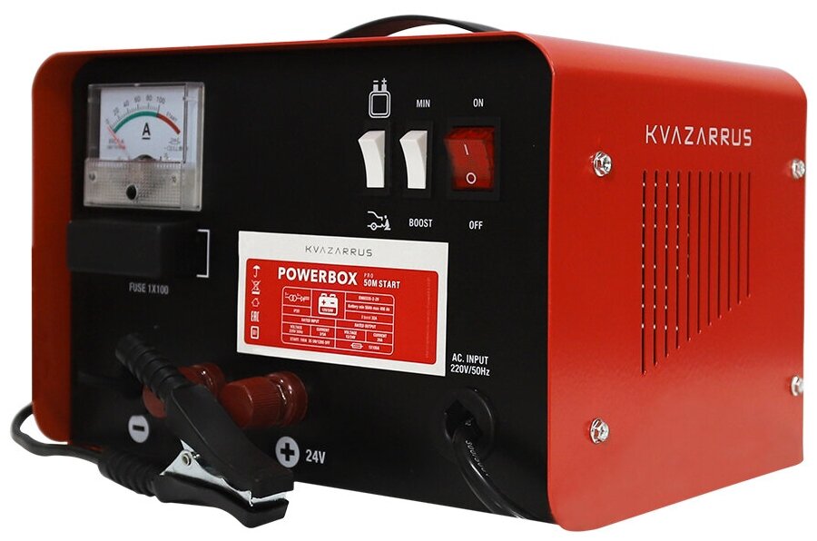 Лучшие цены. Пуско-зарядное устройство KVAZARRUS PowerBox 50M START предназначено для зарядки свинцово-кислотных аккумуляторных батарей, используемых на дизельных и бензиновых двигателях, мотоциклах, моторных лодках и т.д. Оснащено переключателем для выбора нормальной и ускоренной зарядки (BOOST) и функцией «Запуск». Устройство снабжено тепловой защитой. Магазины в вашем городе.