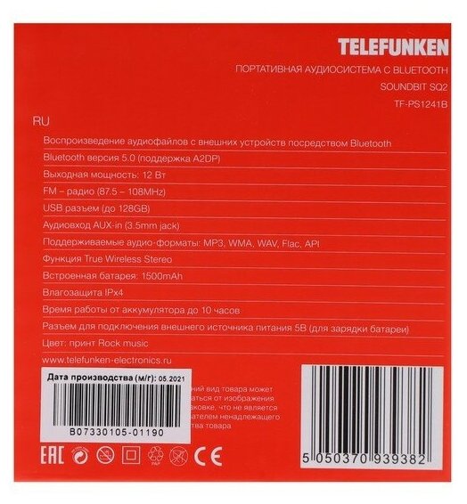 Портативная акустическая система Telefunken Tf-ps1241b Rock music .