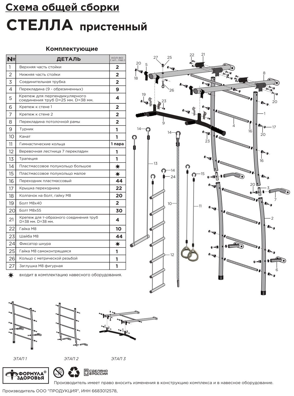 | Компоненты | лестница, турник стационарный, перпендикулярные ручки (рога), трапеция, канат, гимнастические кольца, веревочная лестница |