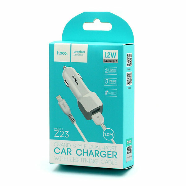 Автомобильная зарядка HOCO Z23 grand style, 2*USB + Кабель USB-Lightning, 2.4A, 12 Вт, белый