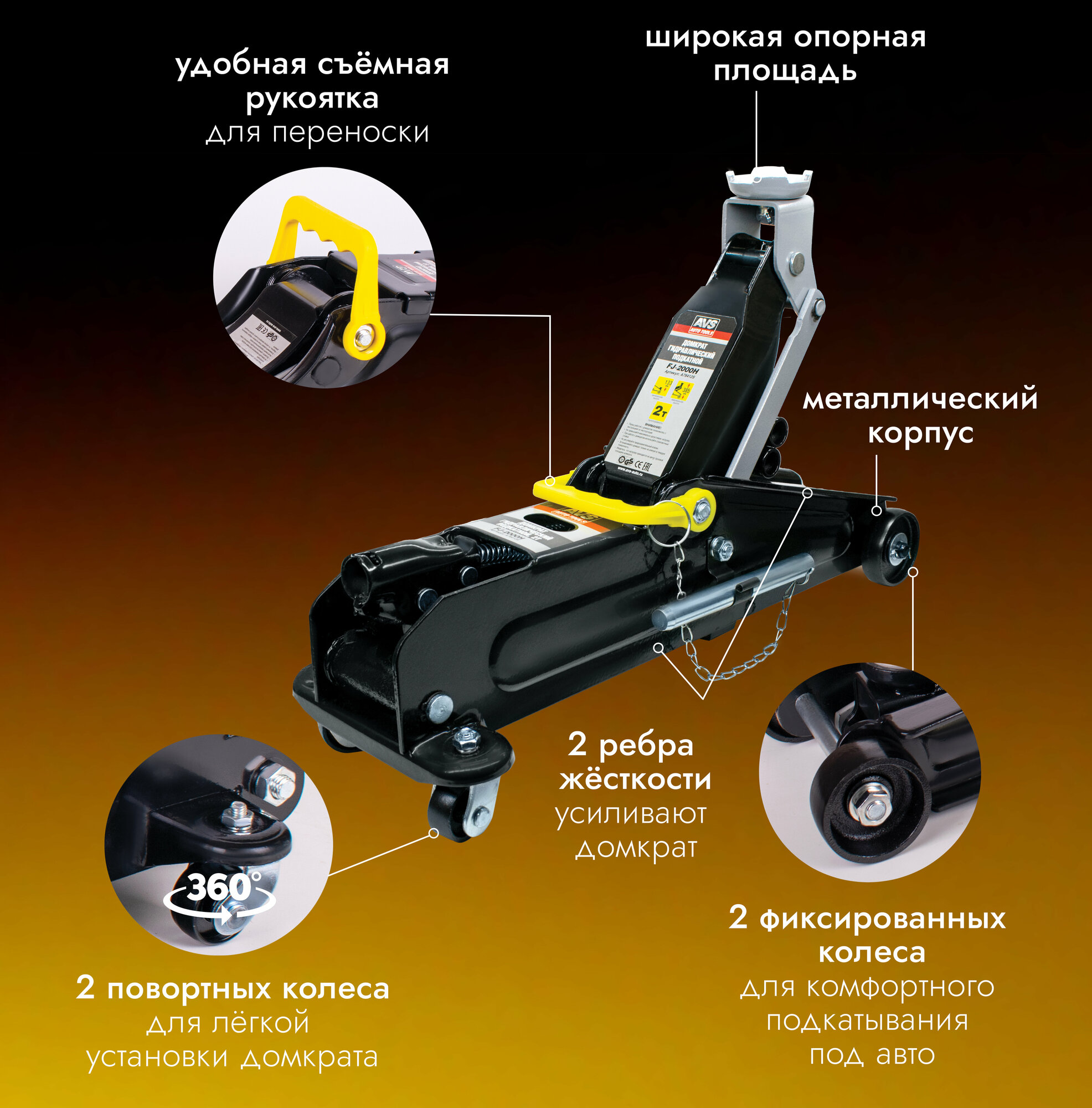 Домкрат автомобильный (подкатной) гидравлический AVS FJ-2000AL (поворотная ручка 360 градусов), 2 тонны, A07814S 8 495 ₽ Подробнее