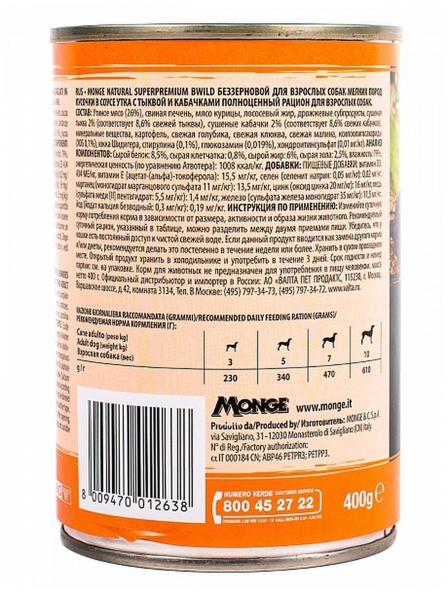 Корм для собак Влажный корм для щенков Monge BWILD Puppy&Junior Anatra, утка, с тыквой, с цукини, 6 шт. х 400 г