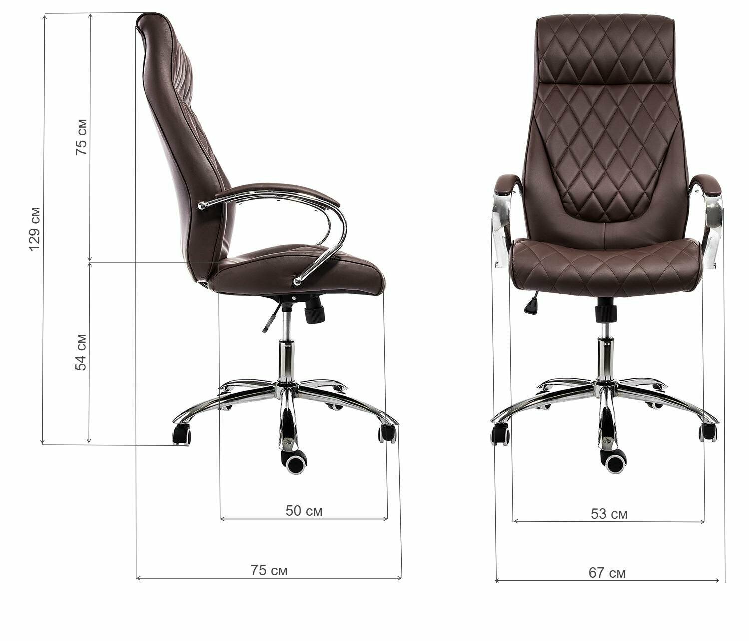 Лучшие цены. Ширина кресла - 67 см; Глубина кресла - 75 см; Высота кресла - 129 см; Ширина сиденья - 53 см; Глубина сиденья - 50 см; Высота сиденья - 54 см; Цвет кресла - коричневый; Цвет крестовины - хром; Материал кресла - экокожа; Материал крестовины - металл; Материал колёс - прорезиненный пластик; Наличие подголовника - да; Наличие колес - да; Поддержка поясницы - нет; Регулировка глубины сиденья - нет; Регулировка подлокотников - нет; Подставка для ног - нет; Механизм качания - да; Тип механизма - топ-ган. Магазины в вашем городе.