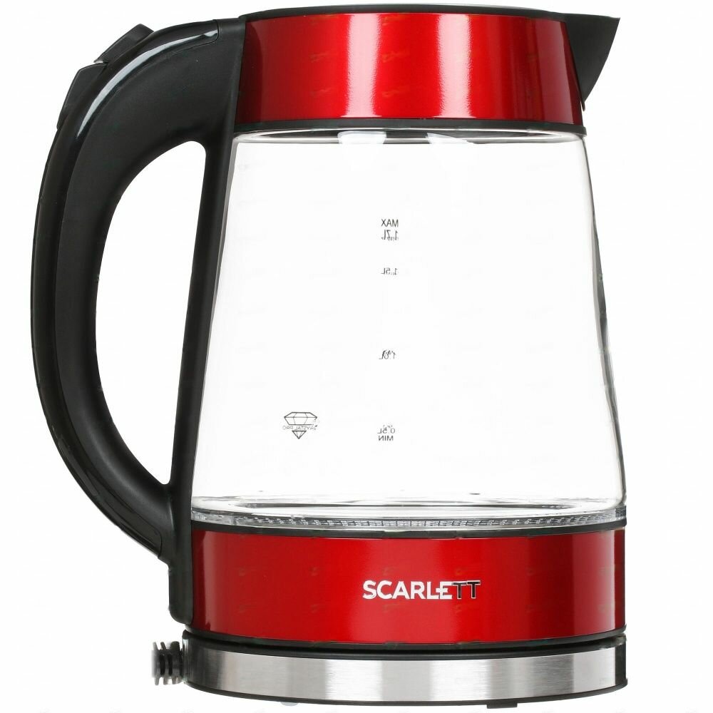 Лучшие цены. Электрочайник Scarlett SC-EK27G79 выполнен в корпусе из прозрачного термостойкого стекла и дополнен пластиковыми декоративными накладками красного цвета. Дисковый нагревательный элемент мощностью 2200 Вт обеспечивает весьма быстрое кипячение воды и характеризуется длительным сроком службы. Сетчатый фильтр в носике, выполненный из нейлона, предотвращает попадание накипи в чашку. Для удобства в использовании чайник оснащен шкалой уровня воды и приятной голубой подсветкой. Магазины в вашем городе.