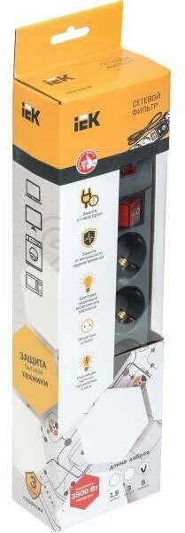 Сетевой фильтр СФ-05К-выкл. 16А 5 мест 5м 3х1мм2 черный IEK (1 шт.)