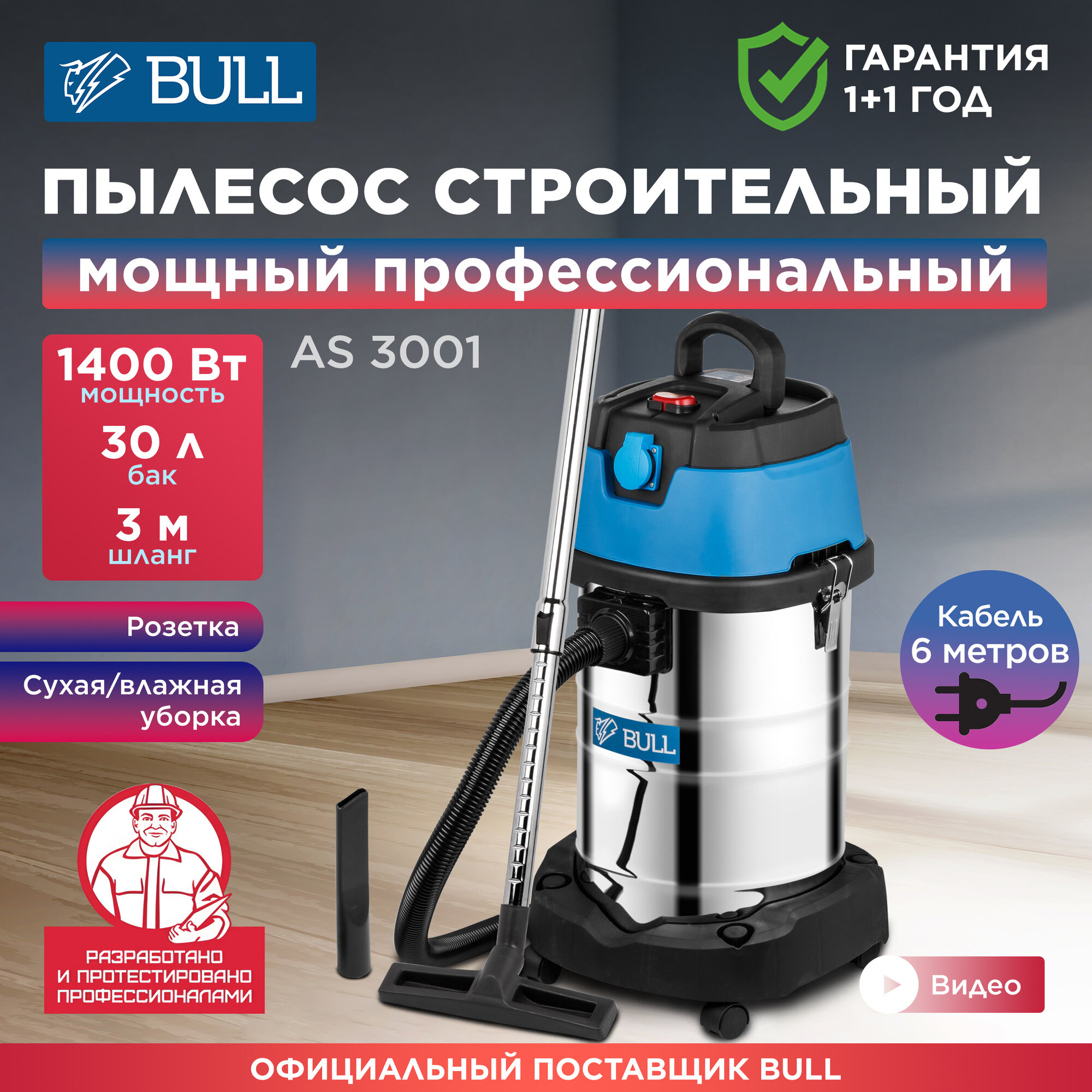 Пылесос BULL AS 3001 + аксессуары 1400 Вт, 30 л, 6м кабель, 3м шланг, HEPA, мануал., выдув (класс: L, очистка: мануальная, автовключение, выдув, 2 фил