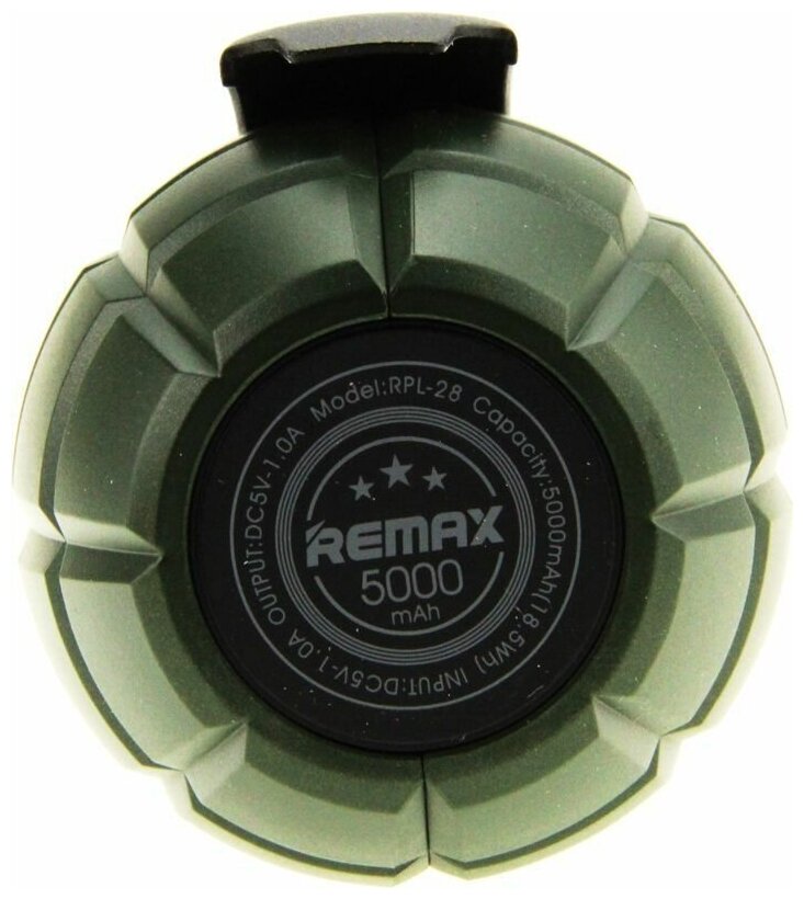 Лучшие цены. Внешний аккумулятор Remax Grenade RPL-28 будет заряжать ваш гаджет везде, где бы вы ни находились. Корпус устройства выполнен в необычном дизайне, стилизованном под гранату Ф1: выглядит эффектно и броско. Оригинальный внешний вид дополняет удобное кольцо-держатель, которое не позволит выронить повербанк из рук. Внутри него спрятан аккумулятор емкостью в 5000 мАч. Такого запаса энергии хватит, чтобы один раз полностью зарядить среднестатистический смартфон. Магазины в вашем городе.