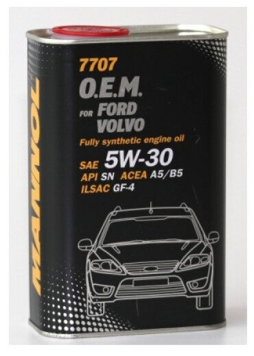 Лучшие цены. Описание Назначение: Масло моторное Тип: синтетическое Объем упаковки, л: 5л. Класс вязкости SAE: 5W-30 Ранее производилось под названием Масло Mannol 7707 O. E. M. 5W-30 for Ford Volvo 4L. Mannol 7707 O. E. M. 5W-30 - синтетическое энергосберегающее моторное масло, специально разработанное для использования в автомобилях FORD и VOLVO. Создано с учетом соответствия последним техническим требованиям бензиновых и современных дизельных двигателей, в которых предусмотрено использование масел стандарта ACEA A5. Магазины в вашем городе.