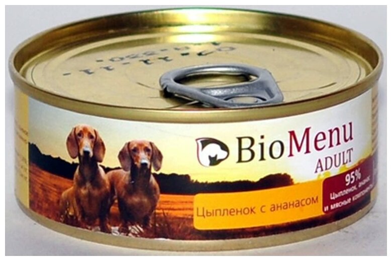 Лучшие цены. Adult цыпленок с ананасом 95 цыпленок, ананас и мясные компоненты для собак 100г - Мясные консервы для собак BioMenu. Изготовлено из натурального российского сырья. Не содержит сои, ароматизаторов, искусственных красителей, ГМИ.Состав: курица, субпродукты мясные, ананас, топинамбур (источник пребиотика инулина), льняное масло (источник омега 3 amp;6), ламинария, натуральная желирующая добавка, соль, витаминно-минеральный комплекс, вода.Анализ: В 100 граммах: протеин-9,0; жир-7,0; углеводы-4,0; клетчатка-0. Магазины в вашем городе.