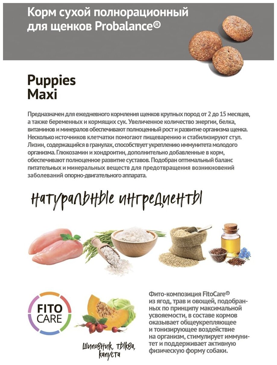 Лучшие цены. Полнорационный натуральный сухой корм премиум-класса для щенков крупных пород. Рацион способствует поддержанию иммунитета и укреплению организма животного. Корм рекомендован для ежедневного кормления щенков с 2 до 12 месяцев, а также беременных и кормящих сук. Корм Probalance Immuno Puppies Maxi разработан практикующими датскими ветеринарами для щенков малых и средних пород, а также собак, которые вынашивают или выкармливают потомство. Особенности корма Probalance для крупных щенков:. Магазины в вашем городе.