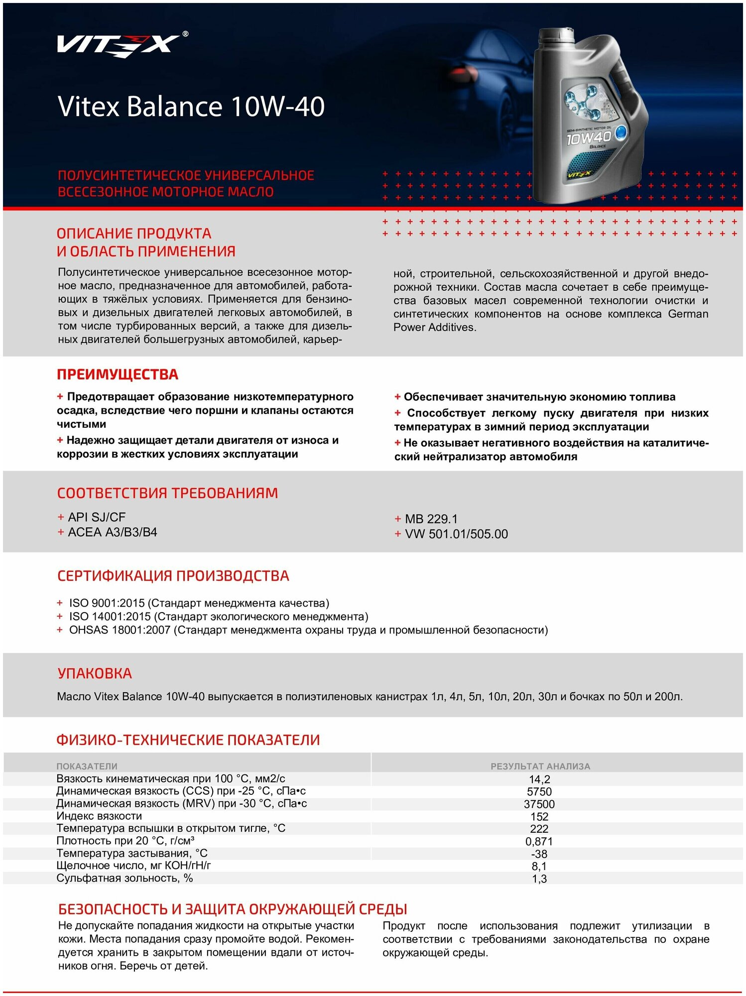 Моторное масло VITEX Balance 10W-40, полусинтетическое, 1 л