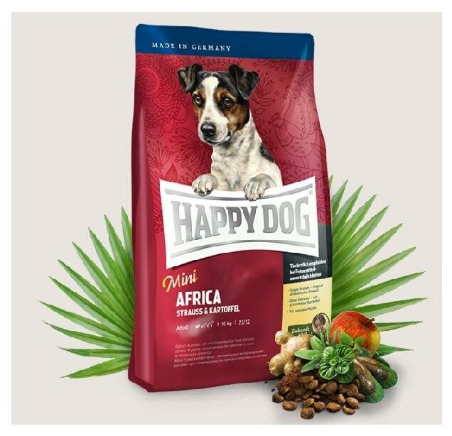 Сухой корм для собак Happy Dog Mini Africa, для здоровья кожи и шерсти, при чувствительном пищеварении, страус, с картофелем 1 уп. х 1 шт. х 4 кг (для мелких и карликовых пород)
