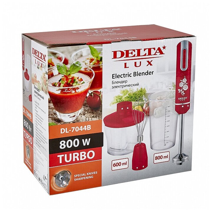 Блендер DELTA LUX DL-7044B красный: 800 Вт, регулир. скорости,"Турбо", стакан, венчик, измельч(8)