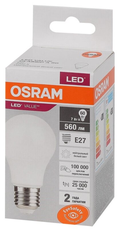 Лучшие цены. Светодиодные лампы OSRAM - разумная замена традиционным лампам накаливания или галогенным лампам. Светодиодные лампы OSRAM снижают затраты на освещение до 90% при сохранении привычного уровня освещенности. Эта лампа OSRAM серии LED Value выполнена в форме колбы A ("груша") с цоколем E27. Материал колбы - пластик, исполнение - матовое. Световой поток 560 люмен, что соответствует лампе накаливания на 60 Вт. Магазины в вашем городе.