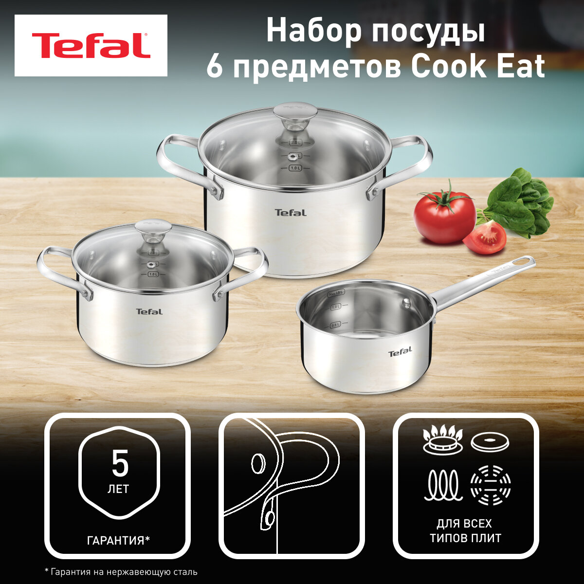 Кастрюли Набор посуды из нержавеющей стали Tefal Cook Eat B921S604, 6 предметов, кастрюли и ковш с крышками, с толстым дном, подходит для индукции