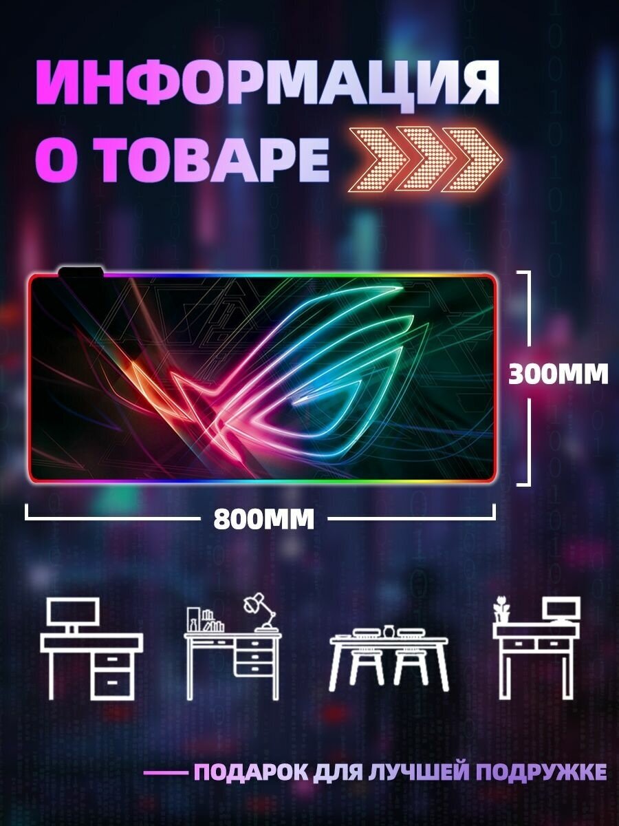 Коврики для мышек Игровой коврик для мыши с RGB подсветкой 800х300х4 мм, водоотталкивающее покрытие, 14 режимов, коврик для клавиатуры и мыши принт ROG RGB