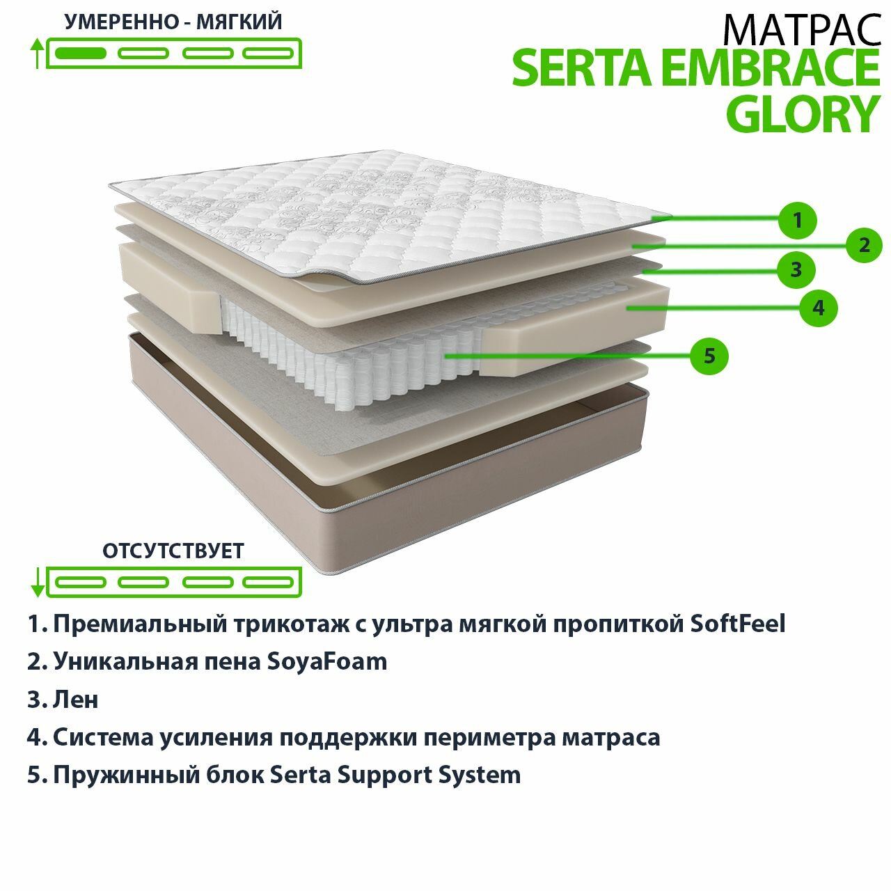 Лучшие цены. Матрас премиум качества Glory из коллекции Serta Embrace — это роскошное изделие, которое предназначено для пользователей, выбирающих изысканность, высокое качество, и натуральность материалов. Serta Glory – односторонний матрас, не требующий переворачивания. Благодаря своей высоте матрас обладает более выраженными анатомическими свойствами. Более 80 лет Serta является одним из ведущих мировых производителей матрасов и аксессуаров для сна и лидером рынка в США. Магазины в вашем городе.