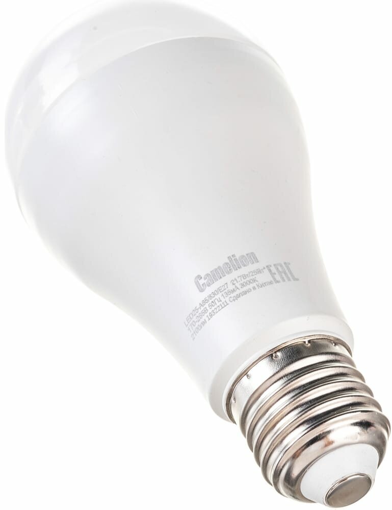 Лучшие цены. Лампа светодиодная Camelion с цоколем Е27 подходит для использования с большинством классических люстр и светильников. Лампочка обладает грушевидной формой белой матовой колбы и имеет цветовую температуру в 3000К. При потреблении всего 25 Вт мощности устройство светит аналогично привычной 200-ваттной лампе накаливания. Магазины в вашем городе.