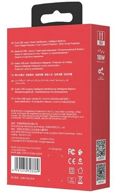 Сетевой адаптер на 3 USB Borofone BA40A, QC3.0, 18W, 3 А, 012338 Белый